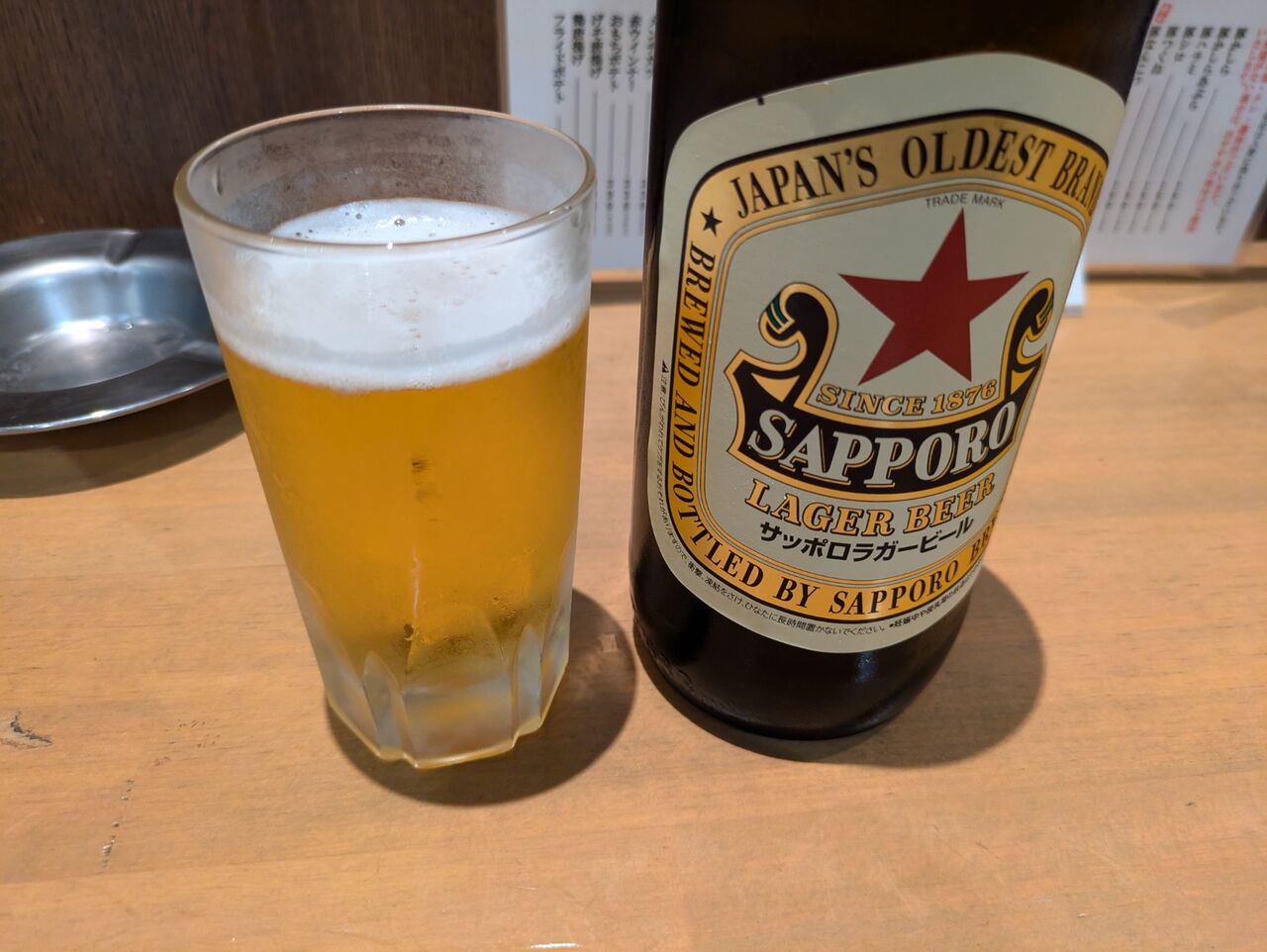 「お飲み物は?」「サッポロラガービール(590円)」をお願いします。」・・・広い店内はがらんとしている。店員さんは2人。のんびりとした平日の昼下がりだ。いい感じ。ドアと窓を通して、前の道を行き交う人々が見える。サッポロラガービールが届く。グラスに注いで、一口・・・んめー。冷えたビールが本当に美味しい。すぐにもう一杯注いで飲む。たまらん!