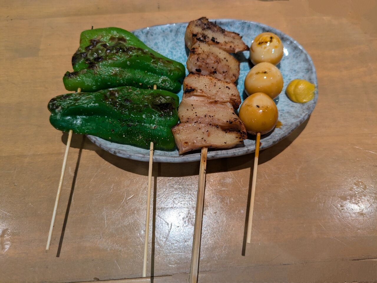 種類の串が届く。先ずはうずらから、一口・・・タレがついている・・・安定の味。大体、自分はゆで玉子が好物で、何個でも食べられるタイプ。だからうずらの玉子ももちろん好みだ。うめー。酎ハイ、酎ハイ。で、ピーマン。一口・・・苦味がいいねー。そういえば、随分前に、荻窪の「カッパ」で食べていた生のピーマンも美味しかったなーと思い出す。ピーマンも好物だ。では、謎の「まぐろシロ」を・・・一口・・・ん、この独特の食感は何だ・・・コリコリしている部分もあるし、柔らかい部分もある・・・塩味が効いていて・・・これは美味い!酎ハイ、酎ハイ!これ、好きだー。