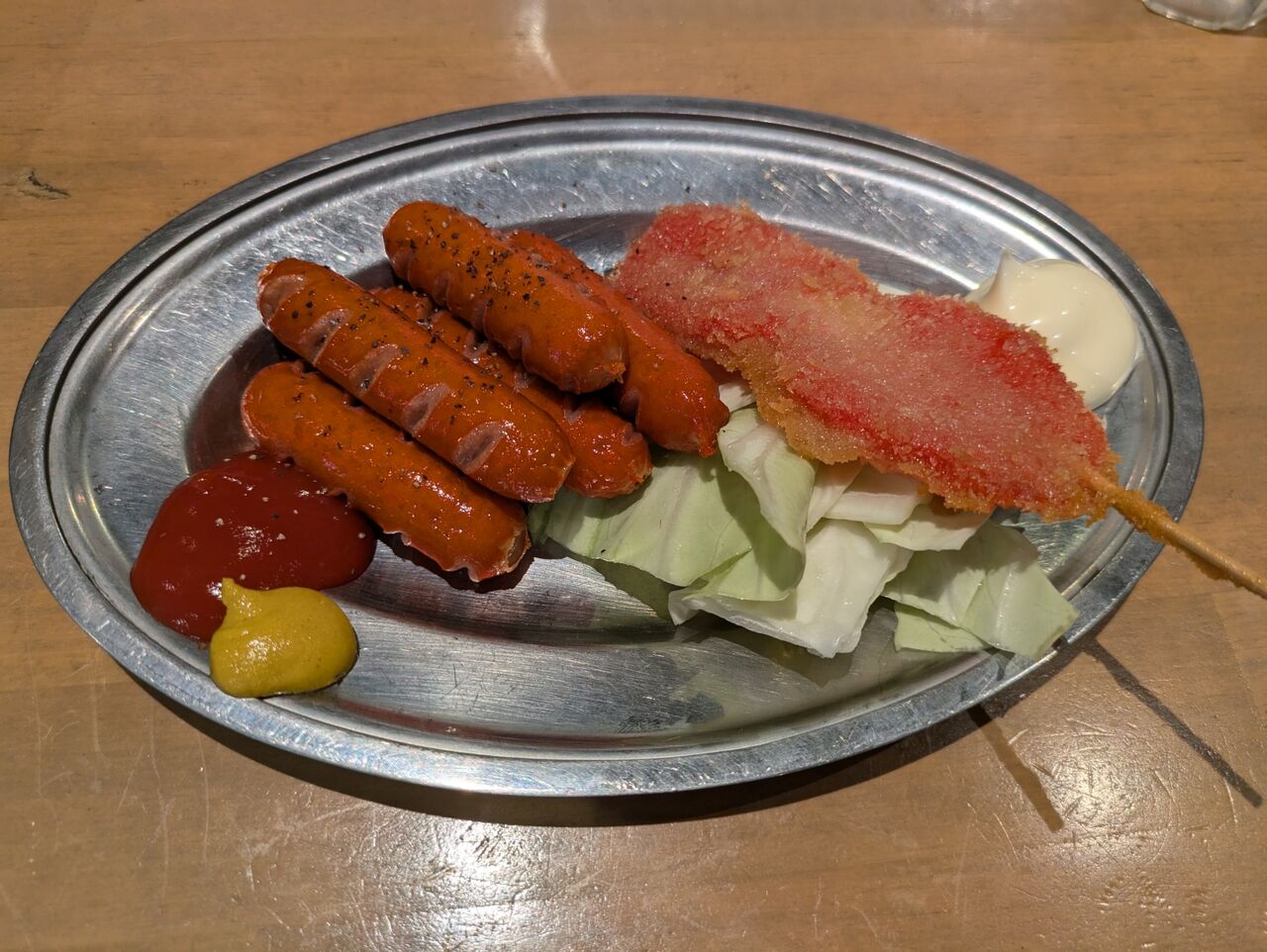 それにしても、早いものでもう6月。ここ何日かは夕方ゲリラ豪雨が降ってきたりして、季節の移り変わりを感じる。赤ウインナーと紅生姜フライが同じ皿に入れられて届く。ケチャップと辛子、マヨネーズが添えてある。先ずは紅生姜フライから。薄くスライスされた紅生姜のフライだ。細切りの紅生姜のかき揚げとは違う。串揚げ風だな。一口・・・うん!生姜の酸味や辛味がガツンとくる。それに油の甘みが加わって、なんとも飽きない味になっている。美味しいなー。ビール、ビール。