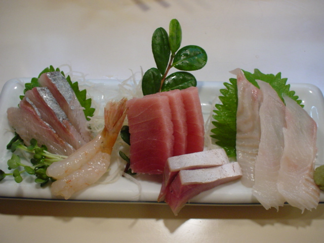 今日の「刺身盛り合わせ」は、ワカシ、シマアジ、ヒラメ、甘エビ、マグロ中トロ。