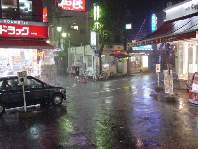 すごい雨だったですよね。久しぶりです、こんなにすごいのは。なんといっても傘が役に立たない。足元からも濡れてくる。写真は西武新宿線野方駅前。電車から降りてきた人たちも駅前で呆然と立ち尽くしていました。みんな傘を持っているんだけど、歩き出す勇気がなかったみたい。